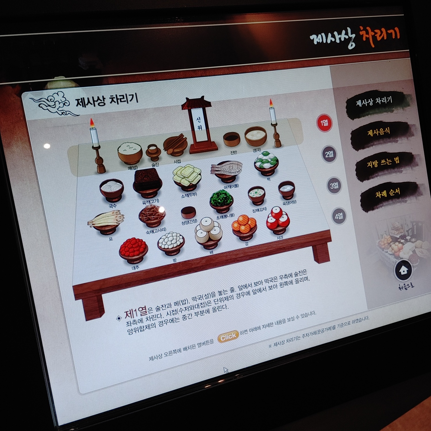 수묵화 그리기 체험, 가훈 짓기 체험, 이승의 다리를 건너서, 제사상 차리기, 원형 입체 영상관, 낙서판