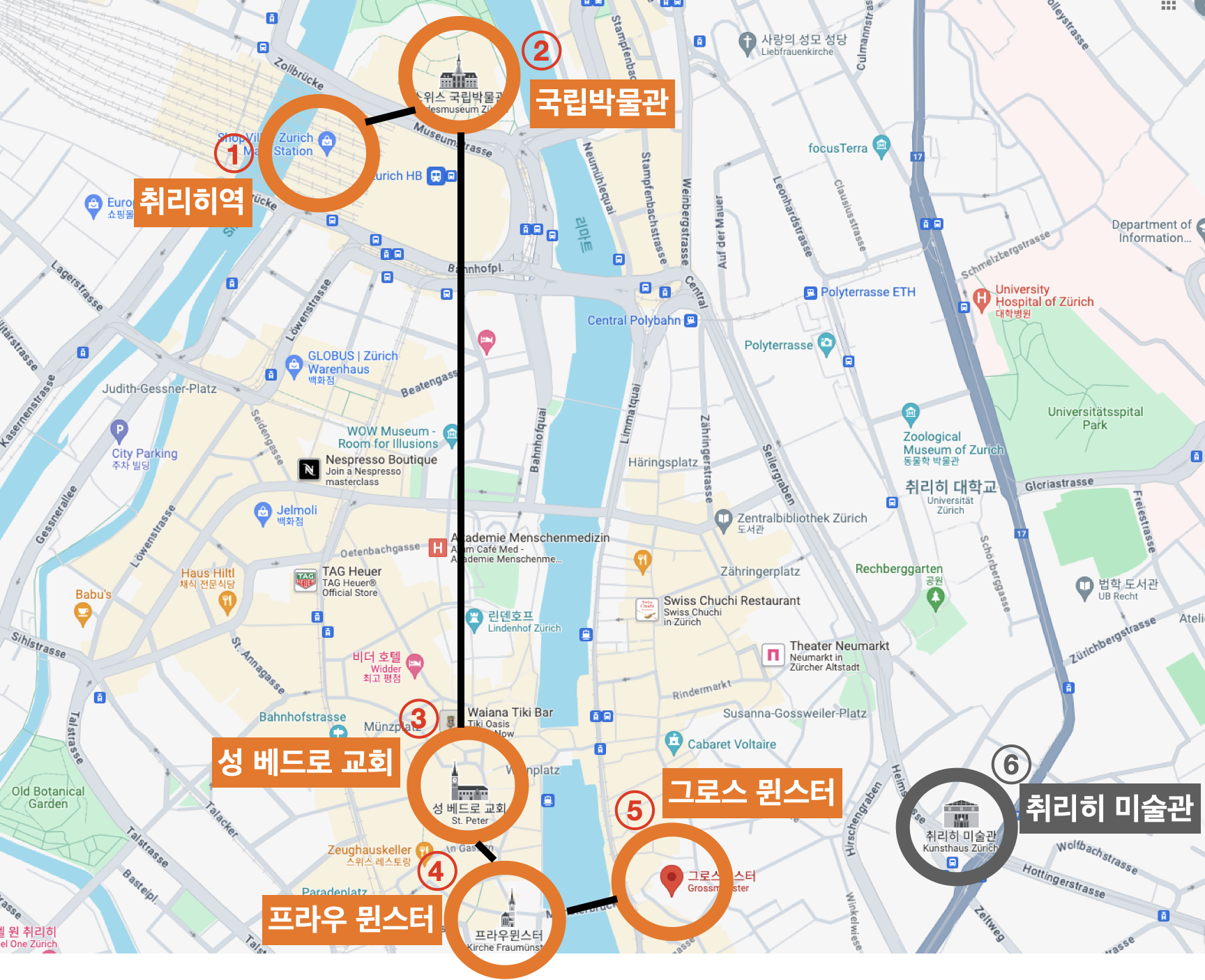 취리히 : 스위스 국립박물관 (Landes museum), 반호프거리(Bahnhof), 프라우뮌스터(Fraumünster), 리마트강(Limmat)